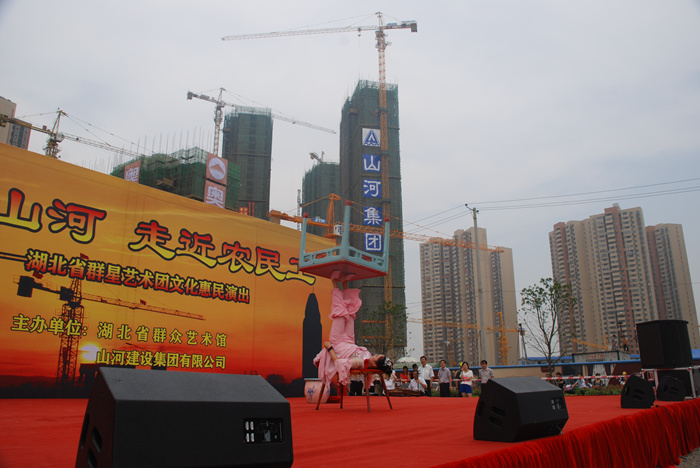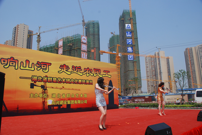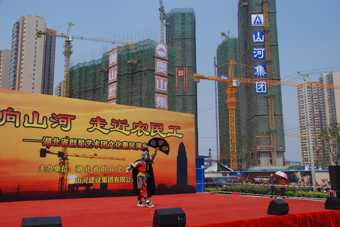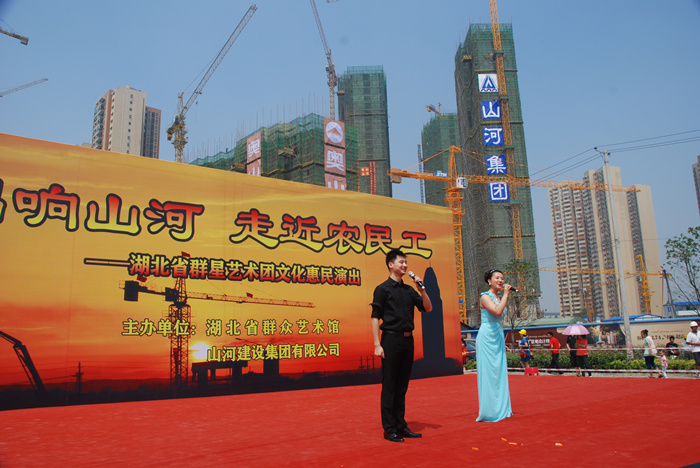 這次惠民演出是由湖北省群藝館與山河集團(tuán)共同舉辦,是山河集團(tuán)關(guān)愛農(nóng)民工的又一項(xiàng)舉措。湖北公司副總經(jīng)理柯為正在致辭中介紹說,作為房建施工總承包特級資質(zhì)企業(yè),山河集團(tuán)已發(fā)展成為投資或控股東升建設(shè)、竹安設(shè)備、益鵬置業(yè)等22家子公司,集建筑產(chǎn)業(yè)、房地產(chǎn)業(yè)、投資業(yè)務(wù)于一體的企業(yè)集團(tuán)。先后榮獲 “全國優(yōu)秀施工企業(yè)”、“全國重合同守信用企業(yè)”、“中國中部地區(qū)建筑業(yè)50強(qiáng)”,連續(xù)八年被湖北省人民政府評定為“建筑企業(yè)綜合實(shí)力20強(qiáng)”??驴傊赋?,成績的取得離不開所有曾經(jīng)和正在為公司發(fā)展而默默奮斗的廣大工友們。