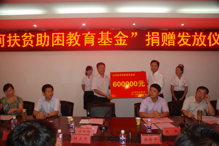 社會成就山河集團,山河集團不忘社會。2006年8月,山河集團與黃岡市總工會共同發(fā)起設立了“黃岡市總工會山河扶貧助學專項資金”?!吧胶臃鲐氈鷮W專項資金”的設立,旨在建立一個長效的助學機制,全力打造“愛心助學”品牌。8年來,山河集團從董事長到基層員工,個個慷慨解囊,人人踴躍捐資,先后幫助2000多名貧困初中生順利進入高中完成學業(yè)、貧困高中生邁進大學校園實現(xiàn)人生夢想。