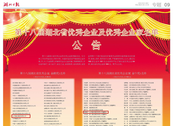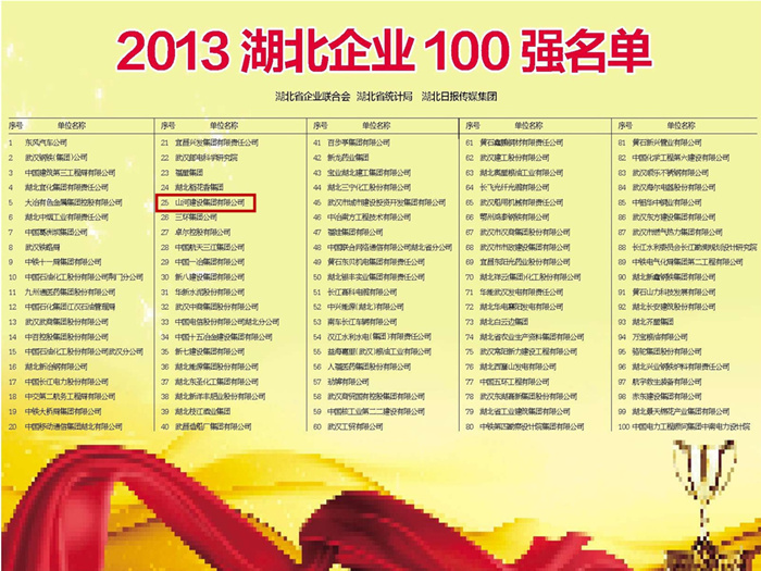 10月22日,2013湖北企業(yè)百強(qiáng)發(fā)布會、第十八屆湖北省優(yōu)秀企業(yè)、優(yōu)秀企業(yè)家表彰大會暨八屆二次會員代表大會隆重舉行。湖北省企業(yè)聯(lián)合會、湖北省統(tǒng)計(jì)局和湖北日報傳媒集團(tuán)聯(lián)合發(fā)布了2013湖北企業(yè)100強(qiáng)名單,山河集團(tuán)位列湖北百強(qiáng)企業(yè)第25位并榮獲“第十八屆湖北省優(yōu)秀企業(yè)(金鶴獎)”。山河集團(tuán)董事長程理財(cái)同時被湖北省企業(yè)聯(lián)合會和湖北省企業(yè)家協(xié)會聯(lián)合授予“第十八屆湖北省優(yōu)秀企業(yè)家(金牛獎)”榮譽(yù)稱號。