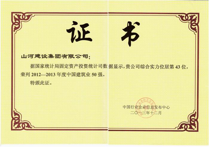 由國家統(tǒng)計局提供最新權(quán)威數(shù)據(jù)支持,中國行業(yè)企業(yè)信息發(fā)布中心主辦的“2013第十二屆中國建筑業(yè)50強測評成果發(fā)布暨頒獎典禮”于2013年12月在京舉行。會上發(fā)布了中國建筑業(yè)50強名單,山河集團位居第43名,提前兩年實現(xiàn)了山河集團 “二五”目標中的該項指標。