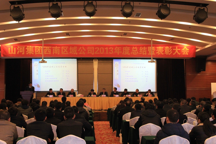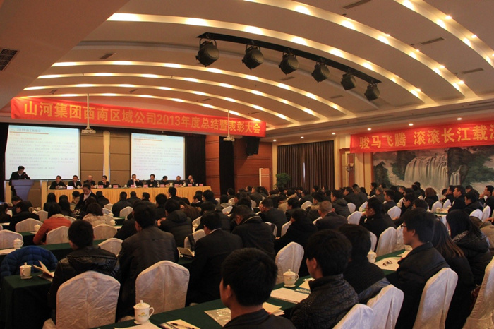 2013年12月28日,重慶鐵山東方山水假日酒店會議大廳內(nèi)張燈結(jié)彩,一派歡樂祥和的喜慶氣氛,山河集團(tuán)西南區(qū)域公司2013年度總結(jié)暨表彰大會在此隆重舉行。此次年會以“理清思路、升級管理、品牌共建、成果共享”為主題,公司領(lǐng)導(dǎo)和員工共聚一堂,在喜迎元旦佳節(jié)的同時,總結(jié)過去、展望未來,群策群力,共商發(fā)展大計。