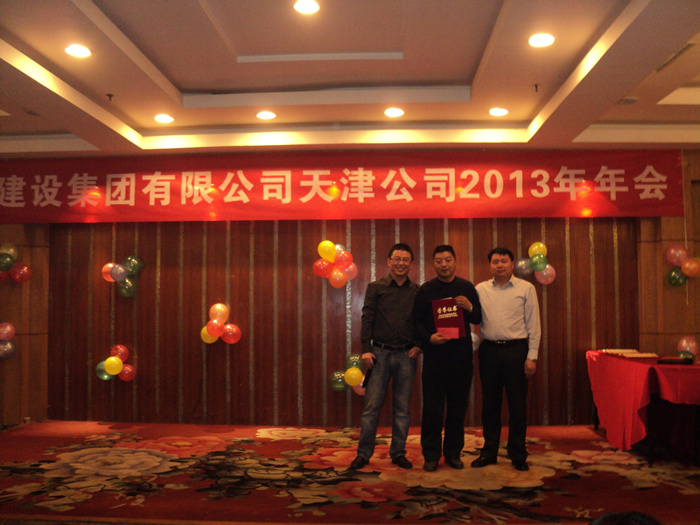 接下來是對2013年成績優(yōu)秀的項目部進行表彰,他們是天津經(jīng)綸科技項目部,天津軍交學(xué)院項目部,河北長城家園項目部。分別由天津公司總經(jīng)理程震洪,集團公司副總兼天津公司總工史紹剛,天津公司黨委書記付志遠(yuǎn)對以上項目部進行頒獎。