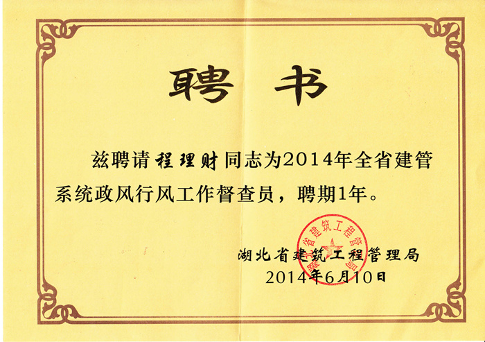 6月10日下午,2014年湖北省建筑工程管理局行風評議督查員聘請儀式暨工作座談會在省建管局五樓會議室召開。集團公司董事長程理財同志被聘請為全省建管系統(tǒng)政風行風工作督查員,湖北省住房和城鄉(xiāng)建設廳黨組成員、建管局局長、黨組書記張弘向15名督查員頒發(fā)了聘書。