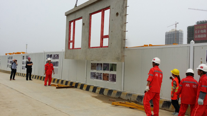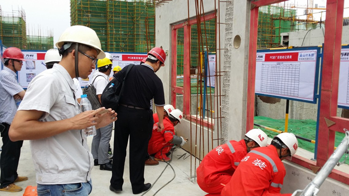 通過項目部數(shù)月的籌劃,南昌萬科海上傳奇項目PC實驗樓于2014年5月26日正式開始吊裝。吊裝前我項目部專業(yè)吊裝人員分別將吊具、調(diào)節(jié)腳碼、斜支撐、鋼絲繩、攬風(fēng)繩、鋼扁擔(dān)等安裝輔助工具準(zhǔn)備就位,依據(jù)技術(shù)交底內(nèi)容、項目部的統(tǒng)籌安排及指揮,按照制定的PC吊裝時間行程,將實驗樓的PC構(gòu)件一次順利吊裝成功并調(diào)試合格。