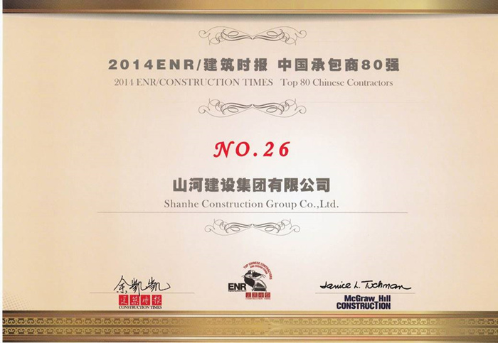 美國《工程新聞記錄》(ENR)和中國《建筑時報》兩家權(quán)威媒體共同主辦的2014年ENR/建筑時報“中國承包商80強和工程設計企業(yè)60強”排名于11月20日在北京揭榜。山河集團再次榜上有名,同比去年上升11位,排名列第26位,也是排行榜中湖北建筑企業(yè)第一名。