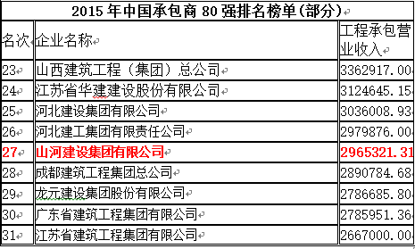 11月19日,2015ENR/建筑時(shí)報(bào)“中國(guó)承包商80強(qiáng)和工程設(shè)計(jì)企業(yè)60強(qiáng)”頒獎(jiǎng)盛典在南京舉行。山河集團(tuán)再次上榜承包商80強(qiáng),排名第27位。