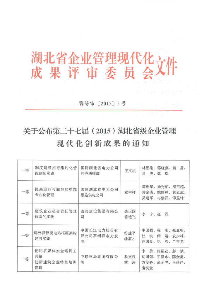2015年12月25日,湖北省第二十七屆(2015)企業(yè)管理現(xiàn)代化創(chuàng)新成果名單公布,山河集團(tuán)申報的《建筑企業(yè)社會責(zé)任管理體系的實(shí)踐》成果榮獲一等獎。