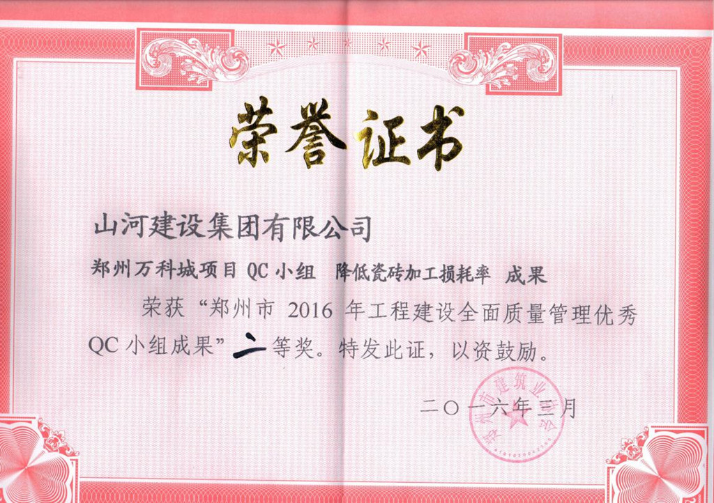 近日,2016年鄭州市優(yōu)秀QC小組成果評選結果揭曉。經專家評審,由山河集團鄭州萬科城項目QC小組編寫的《降低瓷磚加工損耗率》成果榮獲“鄭州市2016年工程建設全面質量管理優(yōu)秀QC小組成果”二等獎。