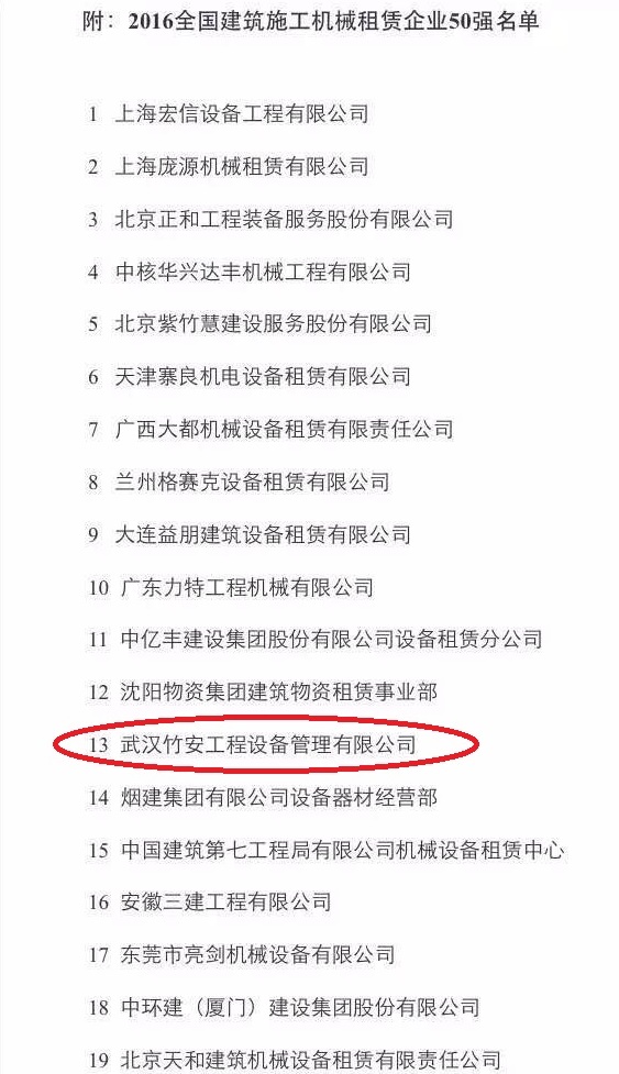 7月15日,由中國(guó)建筑業(yè)協(xié)會(huì)機(jī)械管理與租賃分會(huì)組織開(kāi)展的“2016年全國(guó)建筑機(jī)械50強(qiáng)”評(píng)選活動(dòng)揭曉。武漢竹安設(shè)備管理有限公司再度榮獲“全國(guó)建筑施工機(jī)械租賃50強(qiáng)企業(yè)”榮譽(yù)稱(chēng)號(hào),位列第13名。