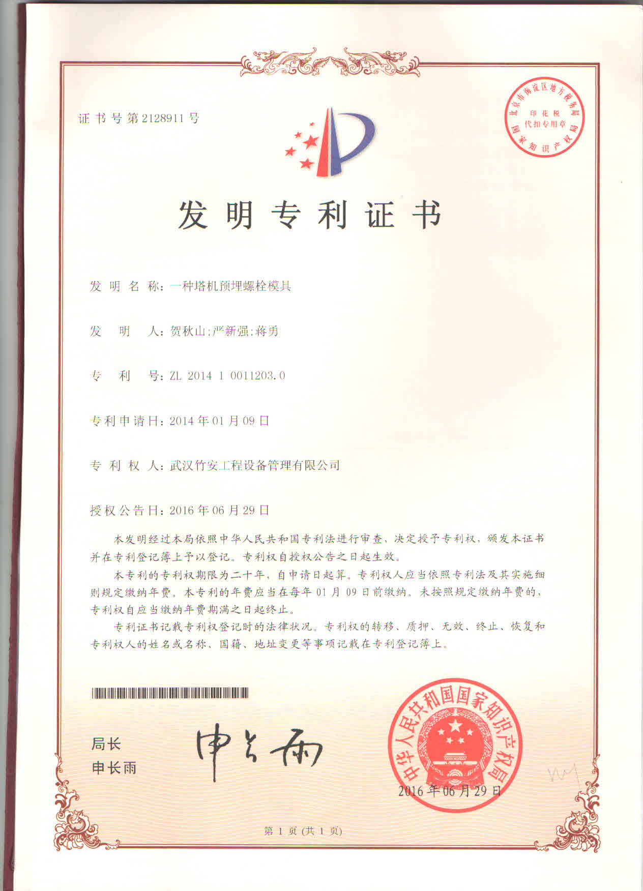 近日,武漢竹安設(shè)備管理有限公司首次研發(fā)的一項(xiàng)發(fā)明專利“一種塔機(jī)預(yù)埋螺栓模具”獲國(guó)家知識(shí)產(chǎn)權(quán)局授權(quán),專利號(hào):ZL200410011203.0。