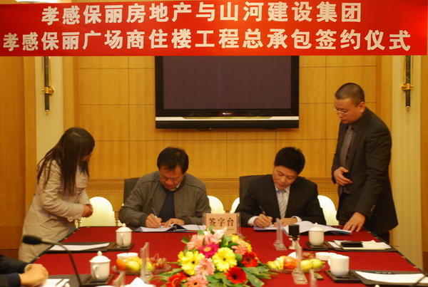 2009年11月23日下午5時,在美麗的東湖之濱,孝感保麗房地產(chǎn)與山河建設(shè)集團舉行了“孝感保麗廣場工程”總承包簽約儀式。